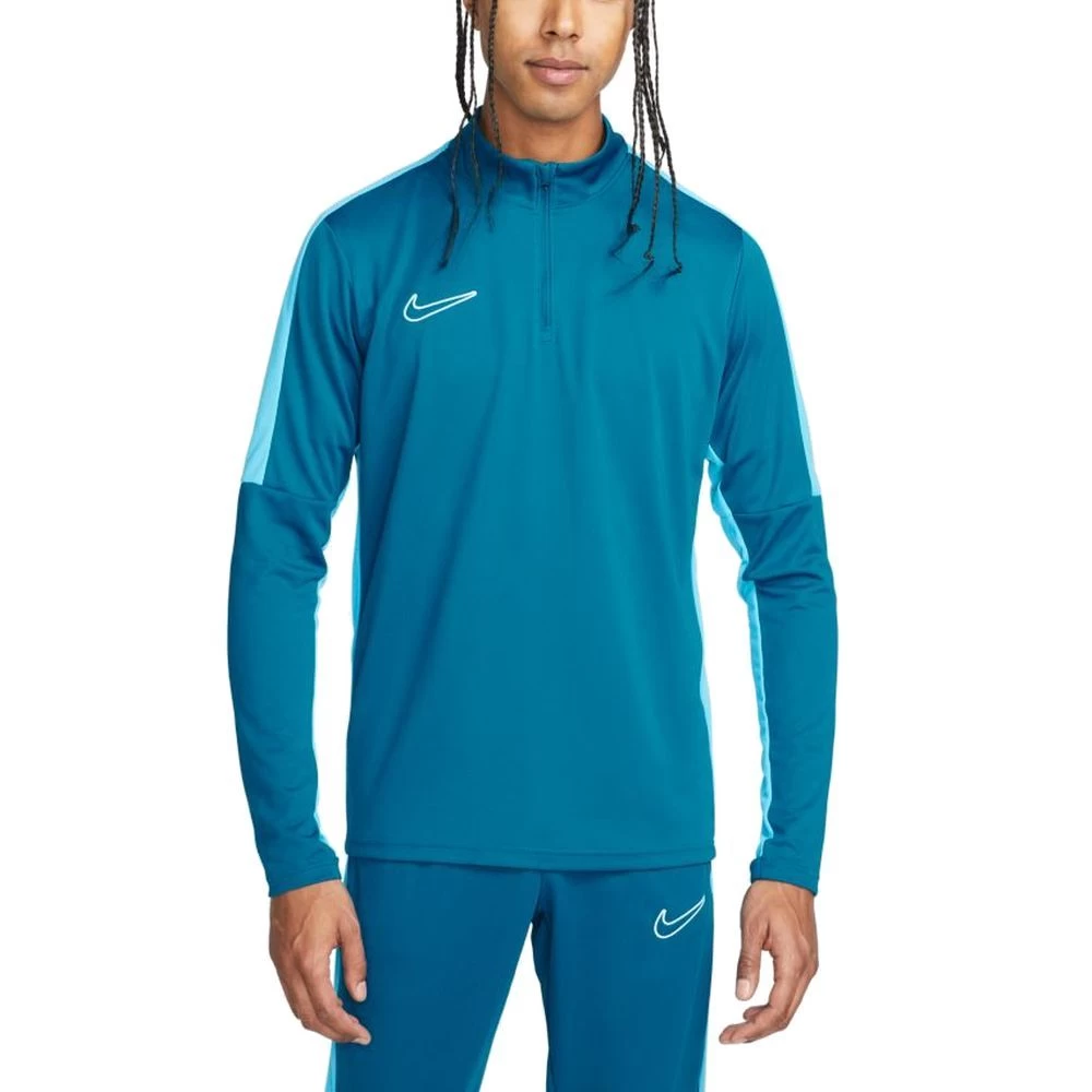 Nike Fußball Academy Dri-FIT Global Football Oberteil für Herren. Das schweißableitende, elastische Academy-Oberteil sorgt für geschmeidigen Schutz auf dem Spielfeld. Atmungsaktive Einsätze sorgen nicht nur beim Training für kühlen Tragekomfort. Es gibt diskrete Daumenöffnungen, damit du den Schutz erweitern kannst, die Ärmel nicht verrutschen und deine Hände warm bleiben. So kannst du passen, dribbeln und werfen, ohne dass dich etwas hindert. Die Nike Dri-FIT-Technologie leitet Schweiß von der Haut ab, wodurch er schneller verdunstet, und ermöglicht so trockenen Tragekomfort. Das Strickmaterial fühlt sich besonders weich an. Mesh-Einsätze an den Seiten sorgen für Atmungsaktivität und kühlen Tragekomfort. Diskrete Daumenöffnungen erweitern den Schutz für zusätzliche Wärme. Viertelreißverschluss. Material: 100% Polyester. Farbe: petrol/baltic blau.